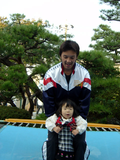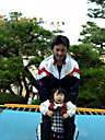 学園祭2日目。今日はトランポリンを体験しました。 瑠衣は一人でジャンプできないのでインストラクターの先生につきそってもらいました。