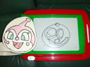 瑠衣は「子供フェスティバル」で作ったお面(テレビ:アンパンマンのなかの「ドキンちゃん」) がとても気に入ったようです。 帰りはママと二人でバスで家まで帰ったのですが、車中もずっと頭にかぶったままでした。 家に帰ってからは、お面の絵を真似ていろいろ絵を描いていました。 左の画像は瑠衣が描いた「ドキンちゃん」です。意外と上手ですね。