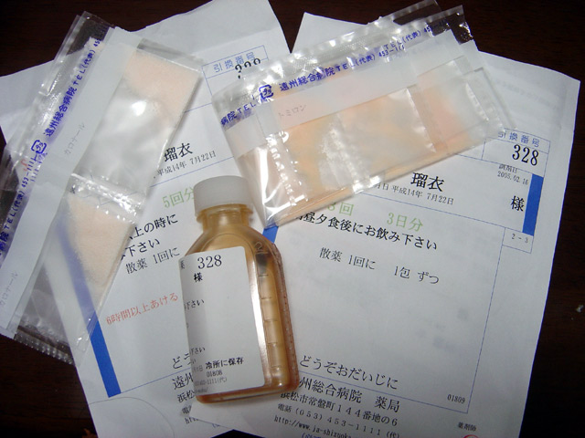 昨日から元気が無かったのですが、熱っぽく、声が枯れて、痰がからんでいるので 近くの遠州総合病院小児科に受診しました。やはり、喉が少しはれていて風邪と診断 されました。 瑠衣は初めて吸入(口をあけて霧状の薬品を吸入)をしてびっくりしたのか、とても 嫌がりました。ママは押さえ込むのが大変で、看護士さんも四苦八苦していました。 でも吸入の効果で痰を吐き出す事ができて声を出しやすくなったようです。 右の画像はいただいた薬です。瑠衣は薬を飲むのは嫌がらないのでその点では楽です。
