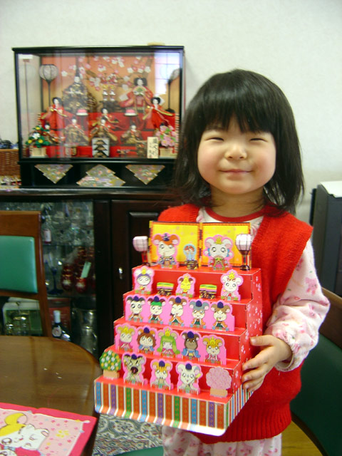 幼児向け雑誌の付録に「ひなかざり」がついていました。 どう考えてもこれは子供ではできないもので結局「ママの力作」となりました。 子供ころによく両親に作ってもらっていたことを思い出しました。 瑠衣は大満足のようで、自分の雛人形の前でご満悦の笑顔です。