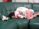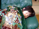 このごろ自分で毛布を持ってきてソファで昼寝するようになりました。 一応、頭は高いほうが良いようで、ソファの肘掛部分を枕にしています。