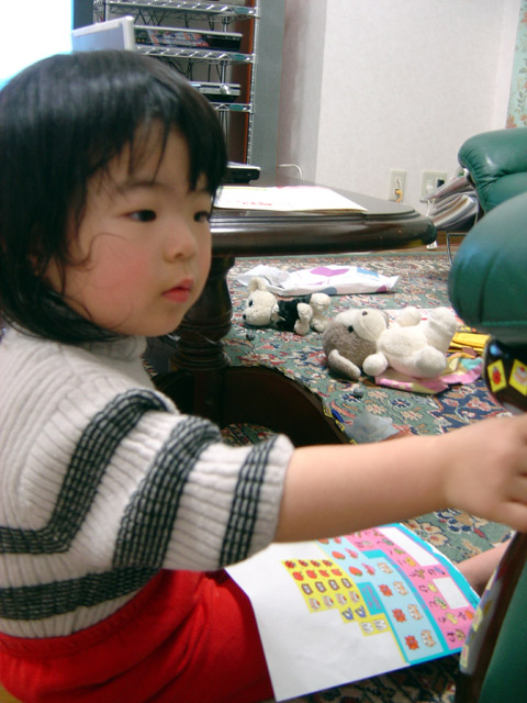 2歳児向けの「学習ドリル」を購入しました。 でも肝心のドリルには興味はあまり無く、付録のシールに夢中です。 ソファーにペタペタ貼って遊んでいたので、ママから「めっ」と注意されたあと、 シールはすべて瑠衣とママではがしました。