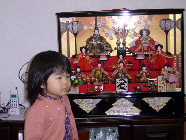 パパの実家に預かってもらっている「おひなさま」を持ってきていただきました。 瑠衣は「おひなさま」を覚えていないと思っていたのですが、飾るとすぐに、 オルゴールを回していました。もしかして覚えていたのでしょうか? 今回で飾るのは3回目ですが、ようやく人形というものがどんなものだか分かった ようです。「きれーね」とそれなりに指を指していました。でも指している先はなぜか お内裏様?